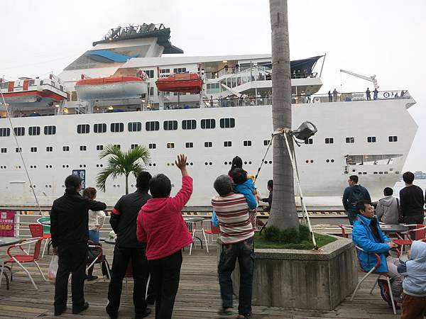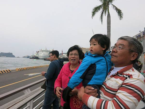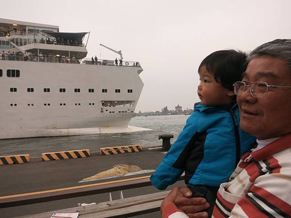 沒去成旗津有點可惜,但誤打誤撞的竟然也在漁人碼頭看到一艘國際郵輪正準備離港,上頭有好多外國人喔!! 有趣的是大家彼此都很有默契的揮著手道Goodbye,外公外婆也不遑多讓的揮著超認真的啦~看到小J 臉上的表情,突然有感每天讓小J 看書上的船,倒不如帶小J 來港口看真正的大船出港來的震撼呢!